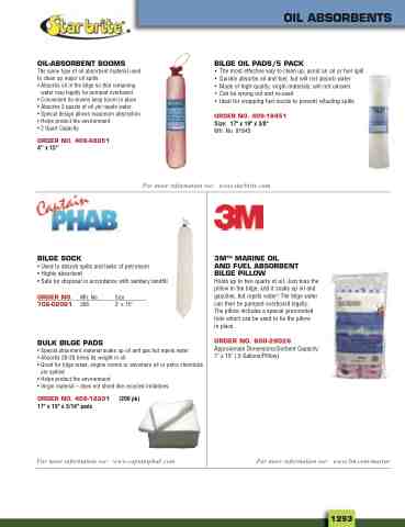 3MTM MARINE OIL AND FUEL ABSORBENT BILGE PILLOW Holds up to two quarts of oil. Just toss the pillow in the bilge, and it soaks up oil and gasoline, but repels water! The bilge water can then be pumped overboard legally. The pillow includes a special grommeted hole which can be used to tie the pillow in place.