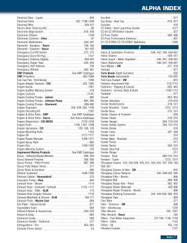 Electro Steer Steering Kits . . . . . . . . . Electronic Bilge Switch . . . . . . . . . . . . Electronic Cleaner . . . . . . . . . . . . . . Electronic Controls - Uflex . . . . . . . . . ElectronicMultimeters............ Elements - Aquabloc - Racor . . . . . . . Elements - Gasoline - Racor . . . . . . . . . . . . . . . . . . . . . . . . .161-163 Emergency Cut-Off Switch . . . . . . . . . . . . . . . . . . . . . . . . .272, 273 Emergency Deck Fill Plug . . . . . . . . . . . . . . . . . . . . . . . . . . . . . .1147 Emergency Distress Signals . . . . . . . . . . . . . . . . . . . . . . . . .450-453 Emergency Repair Tape . . . . . . . . . . . . . . . . . . . . . . . . . . . .339, 933 Emergency VHF Antenna . . . . . . . . . . . . . . . . . . . . . . . . . . . . . . .230 Emergency Whistle . . . . . . . . . . . . . . . . . . . . . . . . . . . . . . .460, 461 EMP Products . . . . . . . . . . . . . . . . . . . . . . . . . . .See EMP Catalogue EMP Propellers . . . . . . . . . . . . . . . . . . . . . . . . . . . . . . . . . .952-1004 End Cap Pad - Shrinkwrap . . . . . . . . . . . . . . . . . . . . . . . . . . . . .1283 Engine Adapter Harness - CDI . . . . . . . . . . . . . . . . . . . . . .120, 1205 Engine Anode . . . . . . . . . . . . . . . . . . . . . . . . . . . . . . . . . . . . . . .1081 Engine Audible Warning System . . . . . . . . . . . . . . . . . . . . . . . . .318 Engine Controls . . . . . . . . . . . . . . . . . . . . . . . . . . . . . . . . . . . .74-87 Engine Cooling Pumps - Jabsco . . . . . . . . . . . . . . . . . . . . . . . . .865 Engine Cooling Pumps - Johnson Pump. . . . . . . . . . . . . . .884, 885 Engine Cooling Pumps - Sherwood . . . . . . . . . . . . . . . . . . .888-892 Engine Degreaser . . . . . . . . . . . . . . . . . . . . . . .556, 559, 562, 1189 Engine Descaling Kit . . . . . . . . . . . . . . . . . . . . . . . . . . . . . . . . .1287 Engine & Drive Parts - EMP . . . . . . . . . . . . . . . .See EMP Catalogue Engine & Drive Parts - Sierra . . . . . . . . . . . . . .See Sierra Catalogue Engine Diagnostics - CDI MEDS . . . . . . . . . . . . . . . . . . . .1212-1216 Engine Flush . . . . . . . . . . . . . . . . . . . . . . . . . . . . . .1196, 1197, 1288 EngineHarnesses-CDI ........................120,128,129 Engine Mounting Bolts . . . . . . . . . . . . . . . . . . . . . . . . . . . . . . .1163 Engine Oil . . . . . . . . . . . . . . . . . . . . . . . . . . . . . . . . . . . . .1171-1177 Engine Repair Manuals . . . . . . . . . . . . . . . . . . . . . . . . . . .1208-1211 Engine Spray Paint . . . . . . . . . . . . . . . . . . . . . . . . . . . . . . . . . . . .893 Engine Stor . . . . . . . . . . . . . . . . . . . . . . . . . . . . . . . . . . .1290-1292 Engine Warning System . . . . . . . . . . . . . . . . . . . . . . . . . . . . . . . .318 Engineered Marine Products . . . . . . . . . . . . . . .See EMP Catalogue Epoxy - Adhesive/Sealer/Mender . . . . . . . . . . . . . . . . . . . . .568, 935 Epoxy General Purpose . . . . . . . . . . . . . . . . . . . . . . . . . . . .568, 935 Epoxy Primer - Pettit Protect . . . . . . . . . . . . . . . . . . . . . . .897, 900 Epoxy Putty Repair Sticks . . . . . . . . . . . . . . . . . . . . . . . . . . . . . .571 Epoxy Resin & Hardener . . . . . . . . . . . . . . . . . . . . . . . . . . . . . . .905 Ethanol Treatment . . . . . . . . . . . . . . . . . . . . . . . . . . . . . . .1290-1292