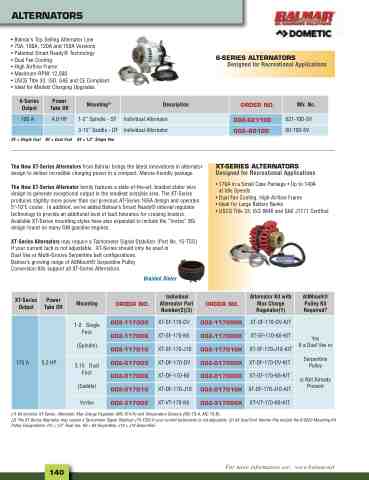 • Balmar’s Top Selling Alternator Line • 70A, 100A, 120A and 150A Versions • Patented Smart Ready® Technology • Dual Fan Cooling • High Airflow Frame • Maximum RPM: 12,000 • USCG Title 33, ISO, SAE and CE Compliant • Ideal for Modest Charging Upgrades