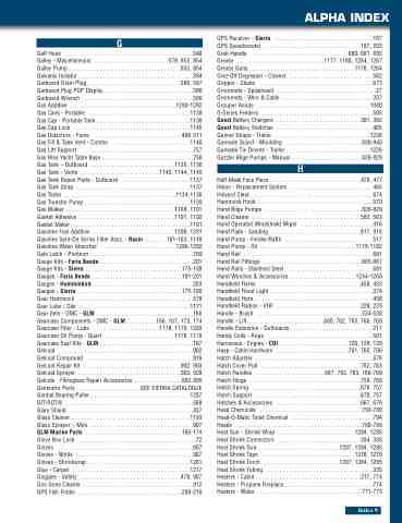 Gaff Hook . . . . . . . . . . . . . . . . . . . . . . . . . . . . . . . . . . . . . . . . . . .540 Galley - Miscellaneous . . . . . . . . . . . . . . . . . . . . . . . . .578, 853, 854 Galley Pump . . . . . . . . . . . . .. . . . . . . . . . . . . . . . . . . . . . . .853, 854 Galvanic Isolator . . . . . . . . . .. . . . . . . . . . . . . . . . . . . . . . . . . . . .394 Garboard Drain Plug . . . . . . . . . . . . . . . . . . . . . . . . . . . . . .586, 587 Garboard Plug POP Display .. . . . . . . . . . . . . . . . . . . . . . . . . . . .586 Garboard Wrench . . . . . . . . .. . . . . . . . . . . . . . . . . . . . . . . . . . . .586 Gas Additive . . . . . . . . . . . . . . . . . . . . . . . . . . . . . . . . . . .1290-1292 Gas Cans - Portable . . . . . .. . . . . . . . . . . . . . . . . . . . . . . . . . .1138 Gas Cap - Portable Tank . . . .. . . . . . . . . . . . . . . . . . . . . . . . . . .1138 Gas Cap Lock . . . . . . . . . . . .. . . . . . . . . . . . . . . . . . . . . . . . . . .1145 Gas Detectors - Fume . . . . . . . . . . . . . . . . . . . . . . . . . . . . .466-511 Gas Fill & Tank Vent - Combo . . . . . . . . . . . . . . . . . . . . . . . . . .1146 Gas Lift Support . . . . . . . . . . . . . . . . . . . . . . . . . . . . . . . . . . . . .757 Gas Rise Yacht Table Base . . . . . . . . . . . . . . . . . . . . . . . . . . . . . .756 Gas Tank – Outboard . . . . . . . . . . . . . . . . . . . . . . . . . . . .1135, 1136 Gas Tank - Vents . . . . . . . . . . . . . . . . . . . . . . . . . .1142, 1144, 1145 Gas Tank Repair Parts - Outboard . . . . . . . . . . . . . . . . . . . . . . .1137 Gas Tank Strap . . . . . . . . . . . . . . . . . . . . . . . . . . . . . . . . . . . . . .1137 Gas Tanks . . . . . . . . . . . . . . . . . . . . . . . . . . . . . . . . . . . . .1134-1136 Gas Transfer Pump . . . . . . . . . . . . . . . . . . . . . . . . . . . . . . . . . . .1139 Gas Walker . . . . . . . . . . . . . . . . . . . . . . . . . . . . . . . . . . . .1188, 1191 Gasket Adhesive . . . . . . . . . . . . . . . . . . . . . . . . . . . . . . . .1191, 1192 Gasket Maker . . . . . . . . . . . . . . . . . . . . . . . . . . . . . . . . . . . . . . .1191 Gasoline Fuel Additive . . . . . . . . . . . . . . . . . . . . . . . . . . .1290, 1291 Gasoline Spin-On Series Filter Assy. - Racor . . . . . . .161-163, 1149 Gasoline Water Absorber . . . . . . . . . . . . . . . . . . . . . . . . .1290-1292 Gate Latch - Pontoon . . . . . . . . . . . . . . . . . . . . . . . . . . . . . . . . . .769 Gauge Kits - Faria Beede . . . . . . . . . . . . . . . . . . . . . . . . . . . . . . .201 Gauge Kits - Sierra . . . . . . . . . . . . . . . . . . . . . . . . . . . . . . . .175-189 Gauges - Faria Beede . . . . . . . . . . . . . . . . . . . . . . . . . . . . . .191-201 Gauges - Humminbird . . . . . . . . . . . . . . . . . . . . . . . . . . . . . . . . .203