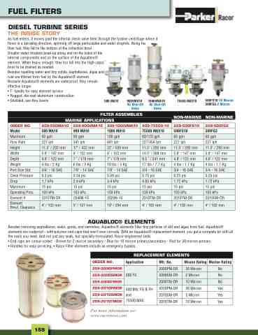 internal components and on the surface of the Aquabloc® element. When heavy enough, they too fall into the high-capacity bowl to be drained as needed. Besides repelling water and tiny solids, asphaltenes, algae and rust are filtered from fuel by the Aquabloc® element. Because Aquabloc® elements are waterproof, they remain effective longer. • T- handle for easy element service • Rugged, die-cast aluminium construction • Sheilded, see-thru bowls