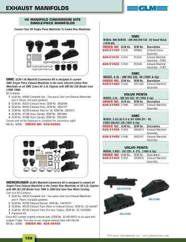 2 GLM No. 89224 Exhaust Hose, OEM No. 3852696 2 GLM No. 89222 Exhaust Hose, OEM No. 3852741 2 GLM No. 50790 Exhaust Tube for V6, OEM No. 3853372 4 GLM No. 01100 Hose Clamps, OEM No. 3853860 4 GLM No. 01090 Hose Clamps, OEM No. 3852604