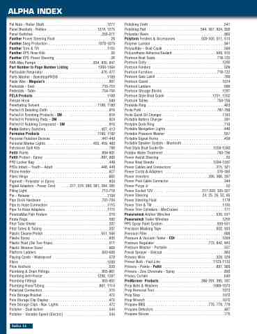 Pal Nuts - Roller Shaft . . . . . . . . . . . . . . . . . . . . . . . . . . . . . . .1277 Panel Brackets - Rollers . . . . . ............ . . . . . . . .1274, 1275 Panel Switches . . . . . . . . . . . . . . . . . . . . . . . . . . . . . . . . . . .256-271 Panther Power Steering Fluid . ............ . . . . . . . . . . . . . . .26 Panther Skeg Protection . . . . . . . . . . . . . . . . . . . . . . . . . .1078-1079 Panther Trim & Tilt . . . . . . . . . ............ . . . . . . . . . . . . .1155 Panther XPS Hose Kits . . . . . . ............ . . . . . . . . . . . . . . .26 Panther XPS Power Steering . . ............ . . . . . . . . . . . . . . .26 PAR-Max Pumps . . . . . . . . . . . . . . . . . . . . . . . . . . . . .834, 835, 847 Part Number to Page Number Listing . . . . . . . . . . . . . . 1304-1364 Particulate Respirator . . . . . . . . . . . . . . . . . . . . . . . . . . . . .476, 477 Parts Washer - BenchtopPRO® . . . . . . . . . . . . . . . . . . . . . . . . .1189 Paste Wax - Meguiar’s . . . ........ . . . . . . . . . . . . . . . . . . . . . .567 Pedestals - Seat . . . . . . . . . . . . . . . . . . . . . . . . . . . . . . . . . .733-753 Pedestals - Table . . . . . . . . . . . . . . . . . . . . . . . . . . . . . . . . . .754-756