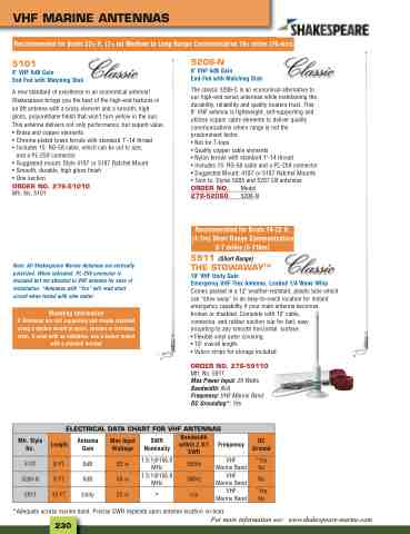 Note: All Shakespeare Marine Antennas are vertically polarized. When indicated, PL-259 connector is included but not attached to VHF antenna for ease of installation. *Antennas with “Yes” will read short circuit when tested with ohm meter.