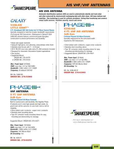 Max. Power Input: 50 Watts SWR: Less than 1.5:1 at 156.8 MHz Bandwidth: 5 MHz within 2.0:1 VSWR Frequency: Broadband VHF/AIS