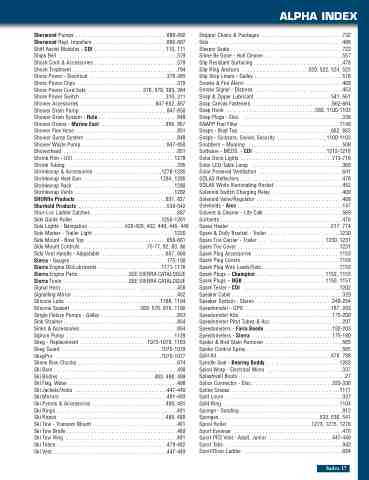 Sherwood Pumps . . . . . . . . . . . . . . . . . . . . . . . . . . . . . . . . .888-892 SherwoodRepl.Impellers............. . . . . . . . . . . . . .886-887 Shift Assist Modules - CDI . . . . . . . . . . . . . . . . . . . . . . . . . .110, 111 Ships Bell . . . . . . . . . . . . . . . . . . . . . . . . . . . . . . . . . . . . . . . . . . .579 Shock Cord & Accessories . . . . . . . . . . . . . . . . . . . . . . . . . . . . . .579 Shock Treatment . . . . . . . . . . . . . . . . . . . . . . . . . . . . . . . . . . . . . .794 Shore Power - Electrical . . . . . . . . . . . . . . . . . . . . . . . . . . . .376-385 Shore Power Clips . . . . . . . . . . . . . . . . . . . . . . . . . . . . . . . . . . . .379 Shore Power Cord Sets . . . . . . . . . . . . . . . . . . . .376, 379, 383, 384 Shore Power Switch . . . . . . . . . . . . . . . . . . . . . . . . . . . . . . .310, 311 Shower Accessories . . . . . . . . . . . . . . . . . . . . . . . . . . .847-852, 857 Shower Drain Pump . . . . . . . . . . . . . . . . . . . . . . . . . . . . . . .847-850 Shower Drain System - Rule . . . . . . . . . . . . . . . . . . . . . . . . . . .848 Shower Drains - Marine East . .. . . . . . . . . . . . . . . . . . . . . .856, 857 Shower Flex Hose . . . . ..... . .. . . . . . . . . . . . . . . . . . . . . . . . . .851 Shower Sump System ..... . .. . . . . . . . . . . . . . . . . . . . . . . . . .848 Shower Waste Pump . . . . . . . . . . . . . . . . . . . . . . . . . . . . . . .847-850 Showerhead . . . . . . . . ..... . .. . . . . . . . . . . . . . . . . . . . . . . . . .851 Shrink Film - UVI . . . . ..... . .. . . . . . . . . . . . . . . . . . . . . . . . .1278 Shrink Tubing . . . . . . ..... . .. . . . . . . . . . . . . . . . . . . . . . . . . .335 Shrinkwrap & Accessories . . . . . . . . . . . . . . . . . . . . . . . .1278-1285 Shrinkwrap Heat Gun . . . . . . . .. . . . . . . . . . . . . . . . . . . .1284, 1285 Shrinkwrap Rack . . . . . . . . . . .. . . . . . . . . . . . . . . . . . . . . . . . .1280 Shrinkwrap Vents . . . . . . . . . . .. . . . . . . . . . . . . . . . . . . . . . . . .1282 SHURflo Products . . . . . . . . . .. . . . . . . . . . . . . . . . . . . . . .831, 837 Shurhold Products . . . . . . . . . . . . . . . . . . . . . . . . . . . . . . . .538-542 Shur-Loc Ladder Catches . . . . .. . . . . . . . . . . . . . . . . . . . . . . . . .687 Side Guide Roller . . . . . . . . . . . . . . . . . . . . . . . . . . . . . .1256-1261 Side Lights - Navigation . . . . . . . . . . . . .426-429, 432, 440, 445, 446 Side Marker - Trailer Light . . . .. . .......... . . . . . . . . . . . . .1220 Side Mount - Boat Top . . . . . . . . . . . . . . . . . . . . . . . . . . . . .658-661 Side Mount Controls . . . . . . . . . . . . . . . . . . . . . . . .75-77, 82, 83, 86 Side Vent Handle - Adjustable .. . .......... . . . . . . . . . .657, 668 Sierra - Gauges . . . . . . . . . . . . . . . . . . . . . . . . . . . . . . . . . .175-190 Sierra Engine Oil/Lubricants . . . . . . . . . . . . . . . . . . . . . . .1171-1178 Sierra Engine Parts . . . . . . . . . . . . . . . . . .SEE SIERRA CATALOGUE Sierra Tools . . . . . . . . . . . . . . . . . . . . . . . .SEE SIERRA CATALOGUE Signal Horn . . . . . . . . . . . . . . . . . . . . . . . . . . . . . . . . . . . . . . . .458 Signalling Mirror . . . . . . . . . . . . . . . . . . . . . . . . . . . . . . . . . . . . .452 Silicone Lube . . . . . . . . . . . . . . . . . . . . . . . . . . . . . . . . .1188, 1194 Silicone Sealant . . . . . . . . . . . . . . . . . . . . . . . . .569, 570, 915, 1192 Single Fixture Pumps - Galley . . . . . . . . . . . . . . . . . . . . . . . . . . .853 Sink Strainer . . . . . . . . . . . . . . . . . . . . . . . . . . . . . . . . . . . . . . . . .854 Sinks & Accessories . . . . . . . . . . . . . . . . . . . . . . . . . . . . . . . . . . .854 Siphon Pump . . . . . . . . . . . . . . . . . . . . . . . . . . . . . . . . . . . . . . .1139 Skeg - Replacement . . . . . . . . . . . . . . . . . . . . . . . .1075-1079, 1163 Skeg Guard . . . . . . . . . . . . . . . . . . . . . . . . . . . . . . . . . . . .1075-1079 SkegPro . . . . . . . . . . . . . . . . . . . . . . . . . . . . . . . . . . . . . .1075-1077 SkeneBowChocks....... . ........... . . . . . . . . . . . . . . . .674 Ski Bars . . . . . . . . . . . . . . . . . . . . . . . . . . . . . . . . . . . . . . . . . . .490 Ski Bridles . . . . . . . . . . . . . . . . . . . . . . . . . . . . . . . . . .483, 488, 489 Ski Flag, Water . . . . . . . . . . . . . . . . . . . . . . . . . .. . . . . . . . . . . . .488 Ski Jackets/Vests . . . . . . . . . . . . . . . . . . . . . . . . . . . . . . . . .447-449 Ski Mirrors . . . . . . . . . . . . . . . . . . . . . . . . . . . . . . . . . . . . . .491-493