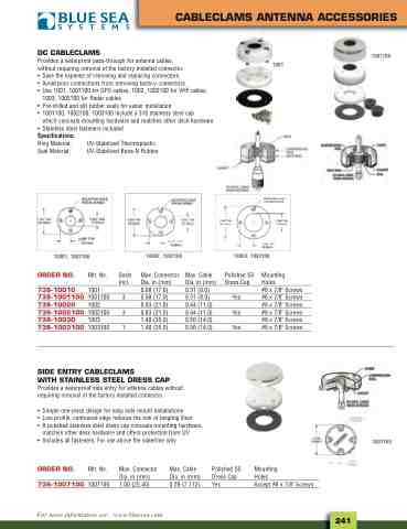 SIDE ENTRY CABLECLAMS WITH STAINLESS STEEL DRESS CAP Provides a waterproof side entry for antenna cables without requiring removal of the factory installed connector.