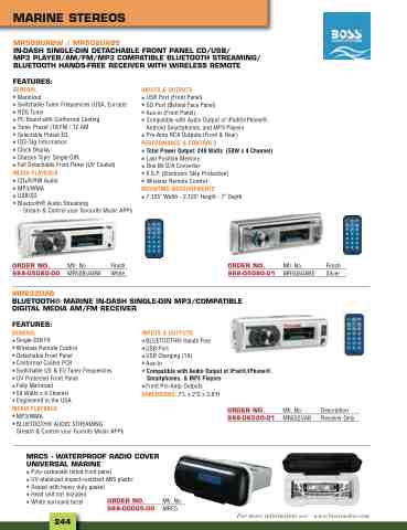 • Marinized • Switchable Tuner Frequencies (USA, Europe) • RDS Tuner • PC Board with Conformal Coating • Tuner Preset (18 FM / 12 AM • Selectable Preset EQ • ID3-Tag Information • Clock Display • Chassis Type: Single-DIN • Full Detachable Front Panel (UV Coated) MEDIA PLAYBACK • CD+R/RW Audio • MP3/WMA • USB/SD • Bluetooth® Audio Streaming