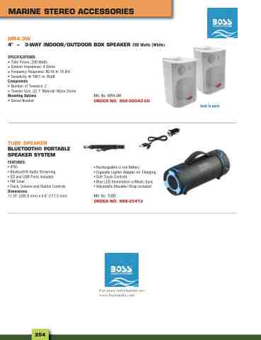 • Total Power: 200 Watts • System Impedance: 4 Ohms • Frequency Response: 80 Hz to 18 kHz • Sensitivity @ 1W/1 m: 85dB Components • Number of Tweeters: 2 • Tweeter Size: (2) 1" Material: Mylar Dome Mounting Options • Swivel Bracket