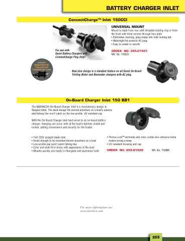 With the On-Board Charger Inlet hard-wired to an on-board battery charger, charging can occur with all the boat’s hatches closed and locked, adding convenience and security for the boater.