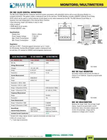 The M2 OLED Digital Monitor measures electrical system parameters with adjustable alarms and an auto-dimming display in a compact enclosure. The gasket creates a waterproof seal on the unit face. The M2 Monitors include a MOSFET External Circuit Relay (ECR) which can be used to control external circuits based on any value measured by the M2. The M2 External Circuit Relay is separate from and independent of the Internal Alarm Function. • Auto-dimming, bright LED display is easy to read • Easy to adjust • 92dB alarm on all models • Isolated MOSFET relay