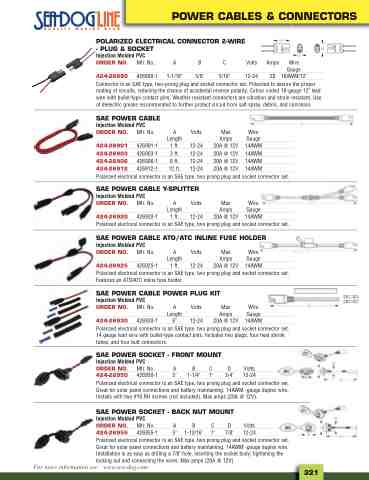ORDER NO. Mfr. No. A B C D Volts 424-26950 426950-1 5" 1-1/4" 1" 3/4" 12-24 Polarized electrical connector is an SAE type, two prong plug and socket connector set. Great for solar panel connections and battery maintaining. 14AWM -gauge duplex wire. Installs with two #10 RH screws (not included). Max amps (20A @ 12V).