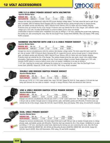 ORDER NO. Mfr. No. A B C Volts Output 424-26522 426522-1 1-7/16" 2-1/4" 1-1/8" 8-32 5V/8A Charges two devices simultaneously. The total output 8.0A load is split 4.0A per side as needed. Enough power to charge phones, pads, and tablets quickly and efficiently. Protective dust cap extends the life of the charger. Installation is as easy as drilling a 1-1/8" hole, inserting the socket body, tightening the locking nut, and connecting the wires. Also fits Power