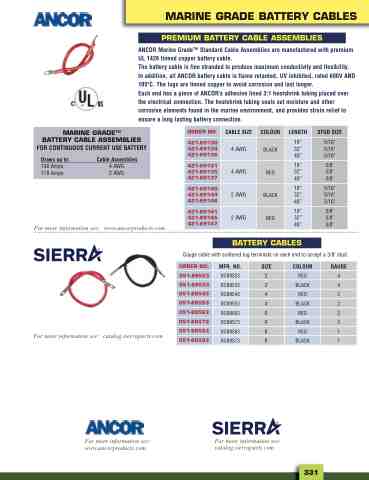 ANCOR Marine GradeTM Standard Cable Assemblies are manufactured with premium UL 1426 tinned copper battery cable. The battery cable is fine stranded to produce maximum conductivity and flexibility. In addition, all ANCOR battery cable is flame retarded, UV inhibited, rated 600V AND 105oC. The lugs are tinned copper to avoid corrosion and last longer.