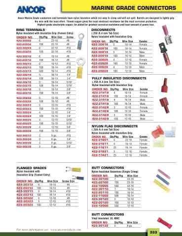 Ancor Marine Grade connectors and terminals have nylon insulators which are easy to crimp and will not split. Barrels are designed to tightly grip the wire with the least effort. Tinned copper gives the least electrical resistance but the most corrosion protection. Highest grade electrolytic copper, tin plated for greatest corrosion resistance and least amount of power loss.