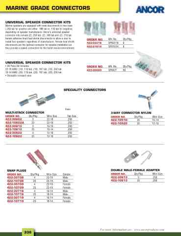 Marine speakers are equipped with male disconnects in two sizes (.250 tab for positive and either .188 tab or .110 tab for negative) depending on speaker manufacturer. Ancor’s universal speaker connector kits include (2) .250 tab, (2) .188 tab and (2) .110 tab female adhesive lined heat shrink disconnects to allow a user to install two speakers regardless of manufacturer. Female heat shrink disconnects are the optimal connector for speaker installation as they provide a sealed connection for the harsh marine environment.