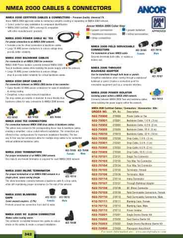 NMEA 2000 CERTIFIED CABLES & CONNECTORS - Premium Quality. Universal Fit. Ancor NMEA 2000 approved cables & connectors simplify creating or expanding an NMEA 2000 network. • Colour coded for easy installation & component identification • NMEA 2000 Certified, 100% universal & compatible