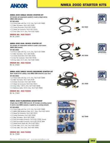 • (1) Power Cable with Tee, 3.3 ft. (1m), Part # 422-70000) • (1) NMEA 2000 Backbone Cable, 32 ft. (10m), Part # 422-70010) • (1) Single Tee Connector, Part # 422-70101) • (1) Female Terminator Part # 422-70105) • (1) Male Terminator, Part # 422-70106) • (1) Field Serviceable Connector, Part # 422-70109), Female • (1) Field Serviceable Connector, Part # 422-70110), Male • (1) Single Device Starter Kit, Part # 422-70201) • (1) Drop Cable, 3.3 ft. (1m), Part # 422-70301) • (1) Drop Cable, 16 ft. (5m), Part # 422-70305)