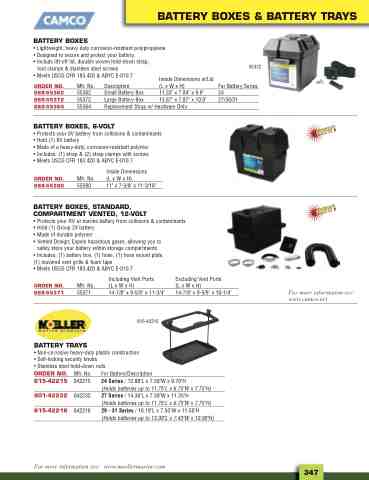 BATTERY BOXES, STANDARD, COMPARTMENT VENTED, 12-VOLT • Protects your RV or marine battery from collisions & contaminants • Hold (1) Group 24 battery • Made of durable polymer • Vented Design: Expels hazardous gases, allowing you to