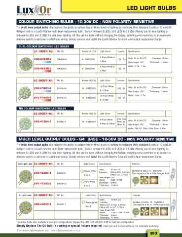 The multi level output bulbs offer boaters the ability to achieve two or three levels of lighting by replacing their standard 5 watt or 10 watt G4 halogen bulb to a LuxOr Marine multi level replacement bulb. Switch between 9 LEDs, to 6 LEDs to 3 LEDs offering you tri level lighting or between 6 LEDs and 3 LEDs for dual level lighting. All this can be done without changing the fixture, installing extra switches or an expensive dimmer switch or add new or additional wiring. Simply remove and install the LuxOr Marine G4 multi level output replacement bulbs.