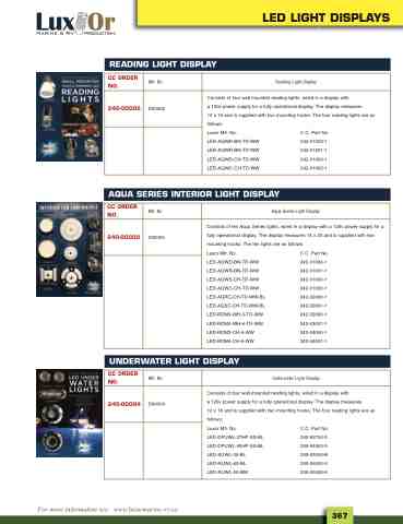 Consists of four wall mounted reading lights, wired in a display with a 120v power supply for a fully operational display. The display measures 12 x 16 and is supplied with two mounting hooks. The four reading lights are as follows: Luxor Mfr. No. LED-AQWD-BN-TD-WW LED-AQWR-BN-TD-WW LED-AQWS-CH-TD-WW LED-AQWC-CH-TD-WW