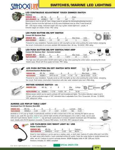 ORDER NO. Mfr. No. A B C Amps 424-03060 / ea. 403060-1 7/8" 7/8" 3/4" 1.5 Short press to turn on and off, then a longer press to activate the dimming/brightening function. Memory function turns the light back on at the same brightness level as when it was turned off. Off – LED ring is orange, maximum bright LED ring is green, lowest light level – purple, in between stages are shades of blue. IP67 rating.