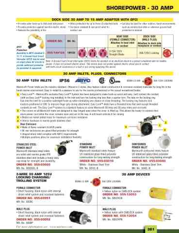• Easy LockTM - Marinco®’s exclusive Easy LockTM System has been designed to make hook-up quick and easy. Just connect the cordset (with an Easy LockTM locking ring installed) to the inlet and turn the locking ring less than a quarter turn. The tabs on the locking ring lock into the inlet for a positive watertight hook-up while eliminating any chance of cross threading. The locking ring features lock locators positioned at 180˚ to improve finger grip during attachment. Easy LockTM inlets have a threaded boss that swill accept threaded cordsets as well. The Easy LockTM system is a standard feature on some Marinco® 30 Amp and 50 amp inlets and cord sets