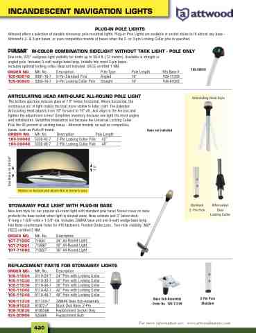 The bottom aperture reduces glare at 7.5° below horizontal. Above horizontal, the continuous arc of light makes the boat more visible to taller craft. The patented Articulating Head adjusts from 15° forward to 15° aft. Just align to the horizon and tighten the adjustment screw! Simplifies inventory because one light fits most angles and installations. Simplifies installation too because the Universal Locking Collar Pole fits 95 percent of existing bases - Attwood models, as well as competitive bases, such as Perko® brand.