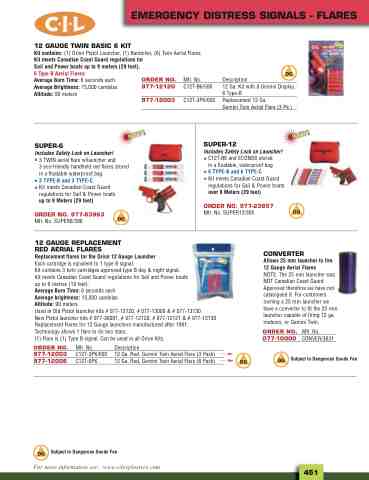 12 GAUGE REPLACEMENT RED AERIAL FLARES Replacement flares for the Orion 12 Gauge Launcher Each cartridge is eqivalent to 1 type B signal. Kit contains 3 twin cartridges approved type B day & night signal. Kit meets Canadian Coast Guard regulations for Sail and Power boats up to 6 metres (19 feet). Average Burn Time: 6 seconds each Average brightness: 15,000 candelas Altitude: 90 meters Used in Old Pistol launcher kits # 077-12120, # 077-13000 & # 077-13130 New Pistol launcher kits # 977-30001, # 977-12120, # 977-12121 & # 977-13130 Replacement Flares for 12 Gauge launchers manufactured after 1981. Technology allows 1 flare to do two stars. (1) Flare is (1) Type B signal. Can be used in all Orion Kits.