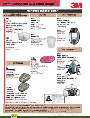 13M recommended for up to 10 times OSHA PEL of zone level organic vapour relief. PARTICULATE FILTERS: 8210, 8511, 2091, 2097, 5N11. Change filter when breathing resistance increases, indicating the filter is loaded with particles. CHEMICAL CARTRIDGES: 6001, 6003. Change the cartridges when the user can taste or smell the contaminant while wearing the respirator. Only use chemical cartridges with contaminants that have good warning properties. 3M and Cool Flow are trademarks of 3M. Used under the licence in Canada. ©2011, 3M. All rights reserved. 1107-02389E