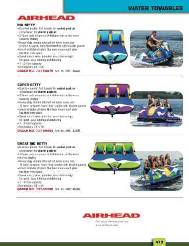 for quick, easy inflating and deflating •1 - 4 Rider capacity •Dimensions: 93" x 85" ORDER NO. 737-58990 Mfr. No. AHBT-3004D