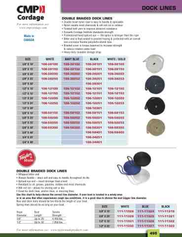 • Whipped bitter end • Always flexible – stays soft and easy to handle throughout its life • Spliced eye end – much stronger than a knot • Resistant to oil, grease, gasoline, mildew and most chemicals • Will not rot – allows for storing wet or dry • Great for dock lines, anchor lines, or mooring lines Use this chart to help choose the correct line diameter. If your boat is located in a windy area or in an area that often experiences rough sea conditions, it is a good idea to choose the next bigger line diameter. Bow and stern lines should be two-thirds the length of your boat. Spring lines should be as long as your boat.