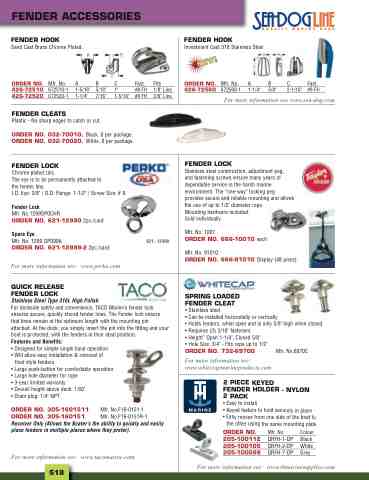 QUICK RELEASE FENDER LOCK Stainless Steel Type 316L High Polish For dockside safety and convenience, TACO Marine’s fender lock ensures secure, quickly stored fender lines. The Fender lock ensure that lines remain at the optimum length with the mounting pin attached. At the dock, you simply insert the pin into the fitting and your boat is protected, with the fenders in their ideal position. Features and Benefits: • Designed for simple single hand operation • Will allow easy installation & removal of