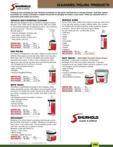 Pro Polish is a fiberglass/gel coat cleaner, sealant and polish with UV inhibitors that produces an ultra high gloss finish in one easy step. Better than a wax, Pro Polish is formulated with cosmetic grade ingredients and contains no fillers or talc, protecting your finish against sun, salt, acid rain and other harsh environmental elements. • All Fibreglass and Gel Coat Exterior Surfaces