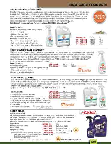 303® Multi-Surface CleanerTM provides the ultimate cleaning power that rinses residue free. Safety brightens and rejuvenates all water-safe surfaces. It leaves surfaces looking new every time. Contains no harsh chemicals, caustic or acids. Thoroughly clean your boat from bow to stern. safe for all types of upholstery and vinyl, 303® Multi-Surface delivers robust cleaning agents that safety remove the most difficult of stains. Ideal for use PRIOR to treating fabrics with 303® Fabric GuardTM