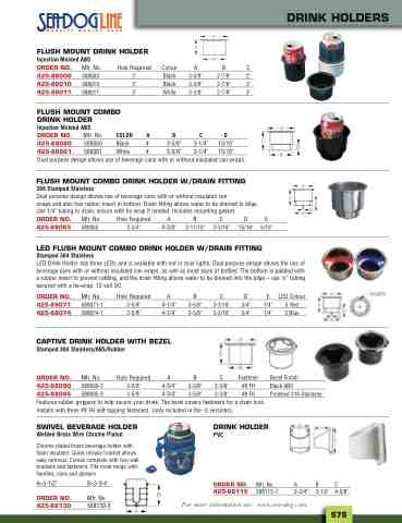 LED Drink Holder has three LEDs and is available with red or blue lights. Dual purpose design allows the use of beverage cans with or without insulated can wraps, as well as most sizes of bottles. The bottom is padded with a rubber insert to prevent rattling, and the drain fitting allows water to be drained into the bilge – use 1⁄4” tubing secured with a tie-wrap. 12 volt DC.