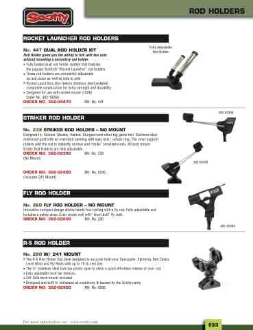 No. 239 STRIKER ROD HOLDER – NO MOUNT Designed for Salmon, Muskie, Halibut, Sturgeon and other big game fish. Stainless steel reinforced post with an oversized opening with easy lock / unlock ring. The inner support rotates with the rod to instantly remove and “strike” simultaneously. All post mount Scotty Rod Holders are fully adjustable. ORDER NO. 382-02390 Mfr. No. 239 (No Mount)