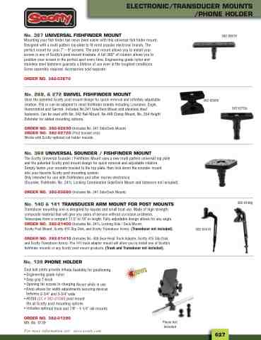 No. 368 UNIVERSAL SOUNDER / FISHFINDER MOUNT The Scotty Universal Sounder / Fishfinder Mount uses a new multi pattern universal top plate and the patented Scotty post mount design for quick removal and adjustable rotation. Simply fasten your sounder bracket to the top plate, then lock down the sounder mount into your favorite Scotty post mounting system. Only intended for use with Fishfinders and other marine electronics. (Sounder, Fishfinder, No. 241L Locking Combination Side/Deck Mount and fasteners not included).