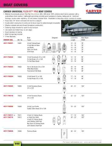 CARVER UNIVERSAL FLEX-FITTM PRO BOAT COVERS • Material: Economically priced, Poly-Flex II is a 5.3 oz. 300 x 300 denier 100% solution-dyed marine polyester with a