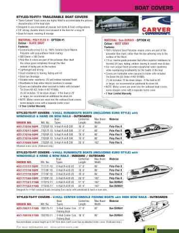 instead of being just on the surface • Lightweight and strong • Good resistance to tearing, fading and rot • Good sun blockage • Durable water repellency, UV and mildew resistant finish • Breathable to help allow interior moisture to escape • Covers are trailerable when secured to trailer with included