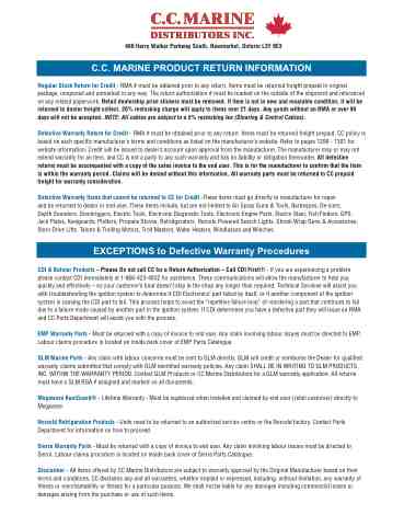 Defective Warranty Items that cannot be returned to CC for Credit -These items must go directly to manufacturer for repair and be returned to dealer or end user. These items include, but are not limited to Air Spray Guns & Tools, Barbeques, De-icers, Depth Sounders, Downriggers, Electric Tools, Electronic Diagnostic Tools, Electronic Engine Parts, Electro Steer, Fish Finders, GPS, Jack Plates, Keelguards, Plotters, Propane Stoves, Refridgerators, Remote Powered Search Lights, Shrink Wrap Guns & Accessories, Stern Drive Lifts, Talons & Trolling Motors, Troll Masters, Water Heaters, Windlasses and Winches.