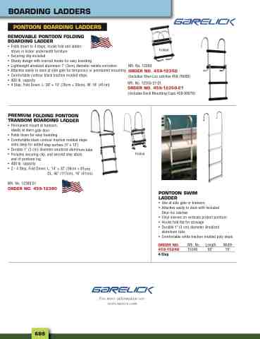 stows in locker underneath furniture • Securing clip included • Sturdy design with overrail hooks for easy boarding • Lightweight anodized aluminum 1" (3cm) diameter resists corrosion Mfr. No. 12350 • Attaches easily to deck at side gate for temporary or permanent mounting ORDER NO. 459-12350 • Comfortable contour black traction molded steps • 400 lb. capacity • 4 Step, Fold Down: L: 30" + 13" (76cm + 33cm), W: 16" (41cm)