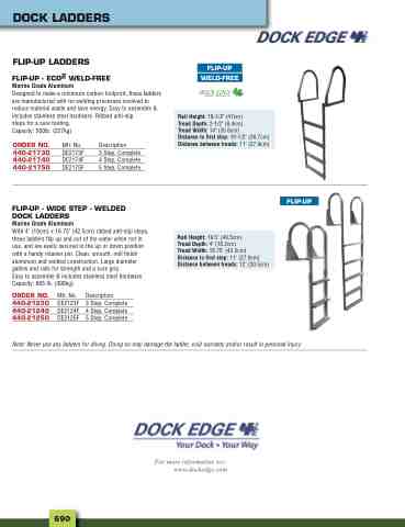 FLIP-UP - WIDE STEP - WELDED DOCK LADDERS Marine Grade Aluminum With 4" (10cm) x 16.75" (42.5cm) ribbed anti-slip steps, these ladders flip up and out of the water when not in use, and are easily secured in the up or down position with a handy retainer pin. Clean, smooth, mill finish aluminum and welded construction. Large diameter gables and rails for strength and a sure grip.