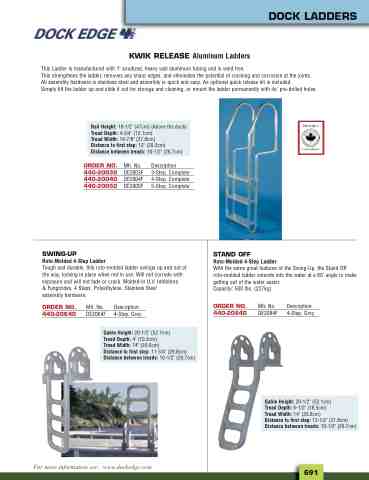 Tough and durable, this roto-molded ladder swings up and out of the way, locking in place when not in use. Will not corrode with exposure and will not fade or crack. Molded-in U.V. Inhibitors & Fungicides. 4 Steps, Polyethylene, Stainless Steel