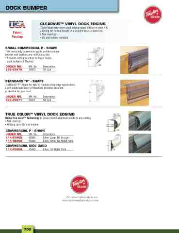 Taylor Made now offers dock edging made entirely of clear PVC, allowing the natural beauty of a wooden dock to stand out. • Non-marring • UV and mildew resistant