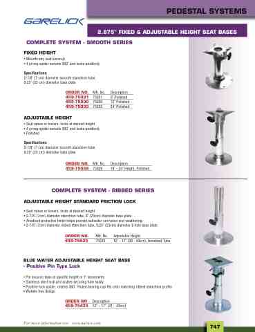 • Seat raises or lowers, locks at desired height • 2-7/8" (7cm) diameter stanchion tube, 9" (23cm) diameter base plate • Anodized protective finish helps prevent saltwater corrosion and weathering. • 2-7/8" (7cm) diameter ribbed stanchion tube, 9.25" (23cm) diameter 6 hole base plate