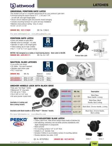 • “Perko Leak Proof” Slide Action design keeps inside of hatches dry • Self-adjusting, ratcheting cam bar/strike permits installations with