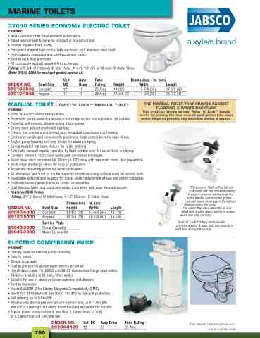 • White vitreous china bowl available in two sizes • Baked enamel seat & cover in compact or household size • Flexible impeller flush pump • Permanent magnet type motor, fully enclosed, with stainless steel shaft • High capacity macerator and bowl scavenger pump • Built-in back flow preventer • All corrosion resistant material for marine use Fitting: 5/8"-3/4" (16-19mm) ID Inlet Hose , 1" or 1-1/2" (25 or 38 mm) ID Outlet Hose Order 37040-0000 for seal and gasket service kit.