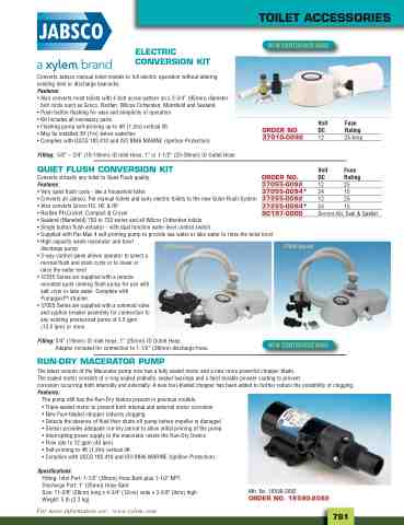 • Raritan PH,Cricket, Compact & Crown • Sealand (Mansfield) 750 to 752 series and all Wilcox Crittenden toilets • Single button flush actuator - with dual function water level control switch • Supplied with Par-Max 4 self-priming pump to provide sea water or lake water to rinse the toilet bowl • High capacity waste macerator and bowl