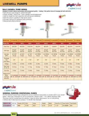 The Rule General Purpose Pump is designed for use as a washdown pump and/or to circulate water to your livewell tank(s). Heavy duty construction for use on commercial or pleasure boats. 1-1/2" (38mm) discharge outlet. This pump must be mounted below the waterline. It does not deliver high pressure, nor is it self-priming. It delivers lots of water but at low pressure. 12 volts DC. Non-Automatic.